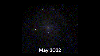 Because of my eVscope2 telescope, I got to reach that goal – albeit not exactly as I imagined it. One of my happiest accidents is that I took a picture of the Pinwheel Galaxy in May of 2022; then, in May of 2023, I was at work when I read the news reports: there was a supernova in the Pinwheel Galaxy, visible to most anyone with a home telescope. I checked the weather, and learned that Seattle’s skies a couple nights later were (shockingly) supposed to be clear. When I finally had a cloudless night, I set up the telescope, and within minutes, I had my supernova. I cropped them together into a small GIF – it’s not pretty, it’s not fully aligned, but they’re my pictures, from my telescope, and I got to see it myself. It still makes me immensely happy.