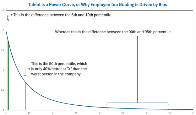 Since talent is a power curve, it’s easy to tell the difference at the top end of the scale. The difference in performance between the 90th and 95th percentiles is much larger than the difference in performance between the 5th and 10th percentiles. So it’s easy to tell who your top performers are, but hard to tell who your bottom performers are.