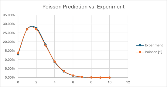 Turns out there’s a function that nicely describes the likelihood of X occurrences in Y events, when the expected outcome is Z occurrences. It’s called a Poisson distribution. [https://en.wikipedia.org/wiki/Poisson_distribution] You can model this pretty easily in Excel, by generating random numbers for cohorts of 40 people, then mapping how many actually end up in LE, HV1, HV2, and so on, assuming strict application of The Curve. I did it for 100,000 cohorts of 40 people, and my results vs. the predicted Poisson curve matched quite well.