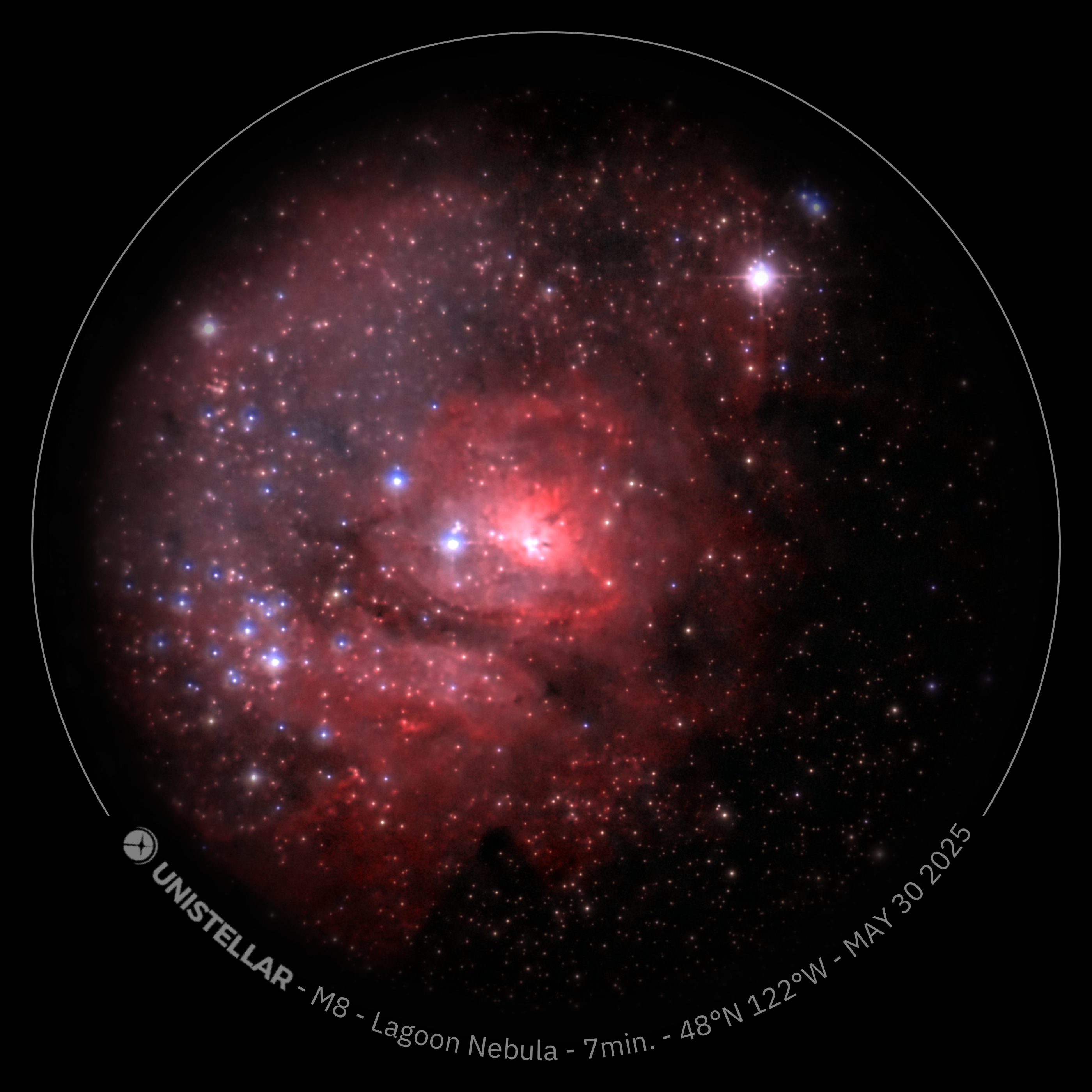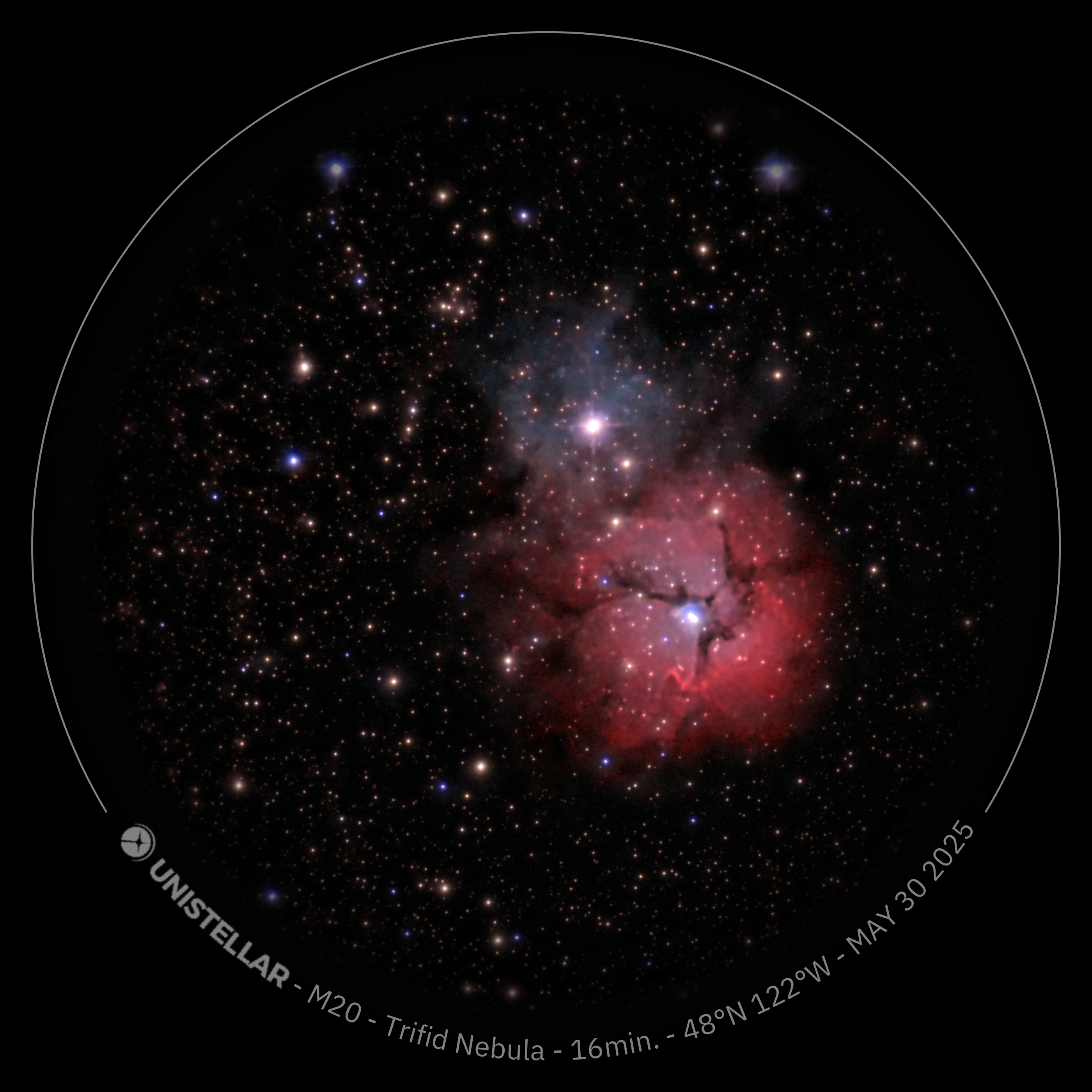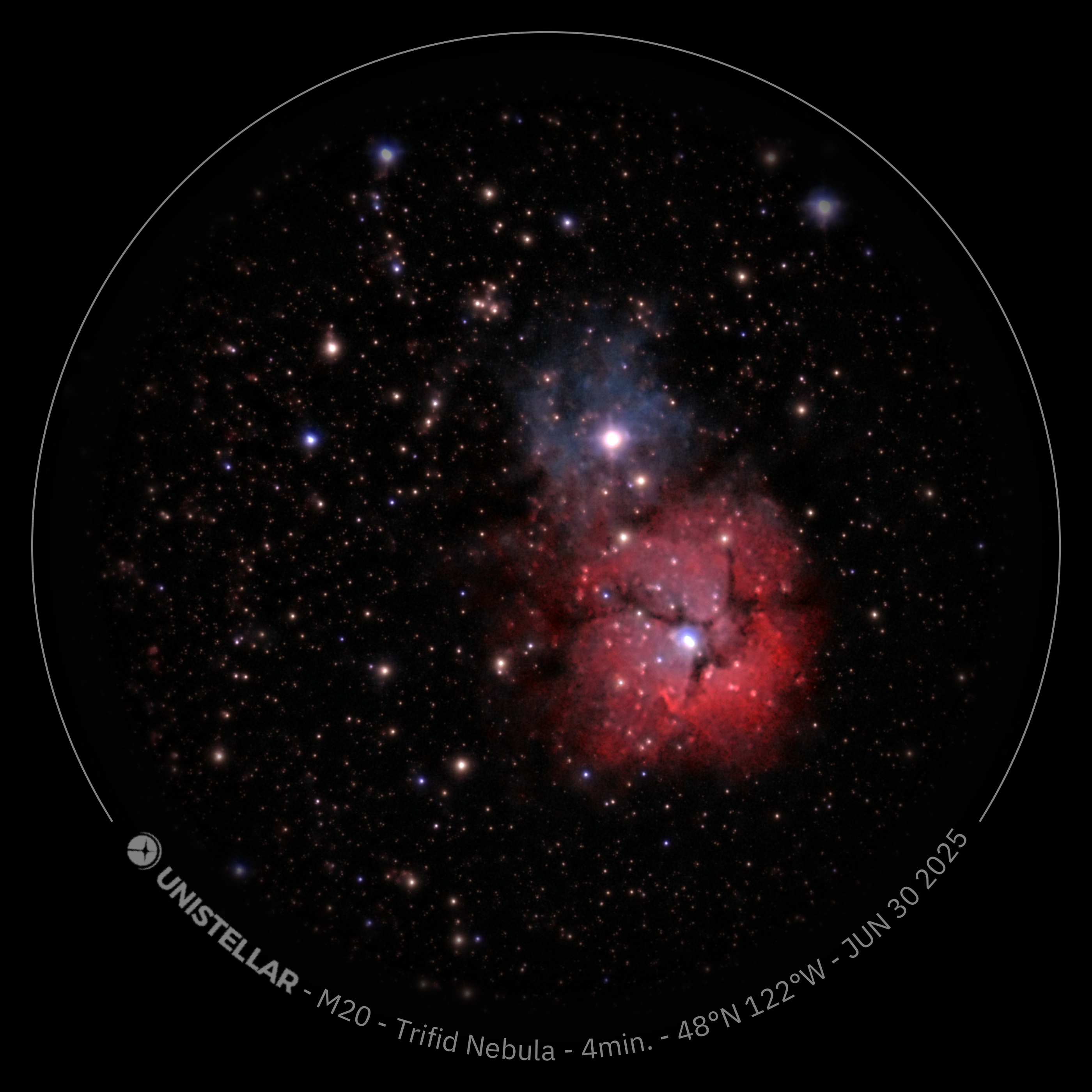 The Trifid Nebula is actually three nebulae: a dense, red, emission nebula, a wispier blue reflection nebula, and a spiky, shadowy dark nebula in front. The VVT software update really makes this an excellent nebula for the eVscope to image.