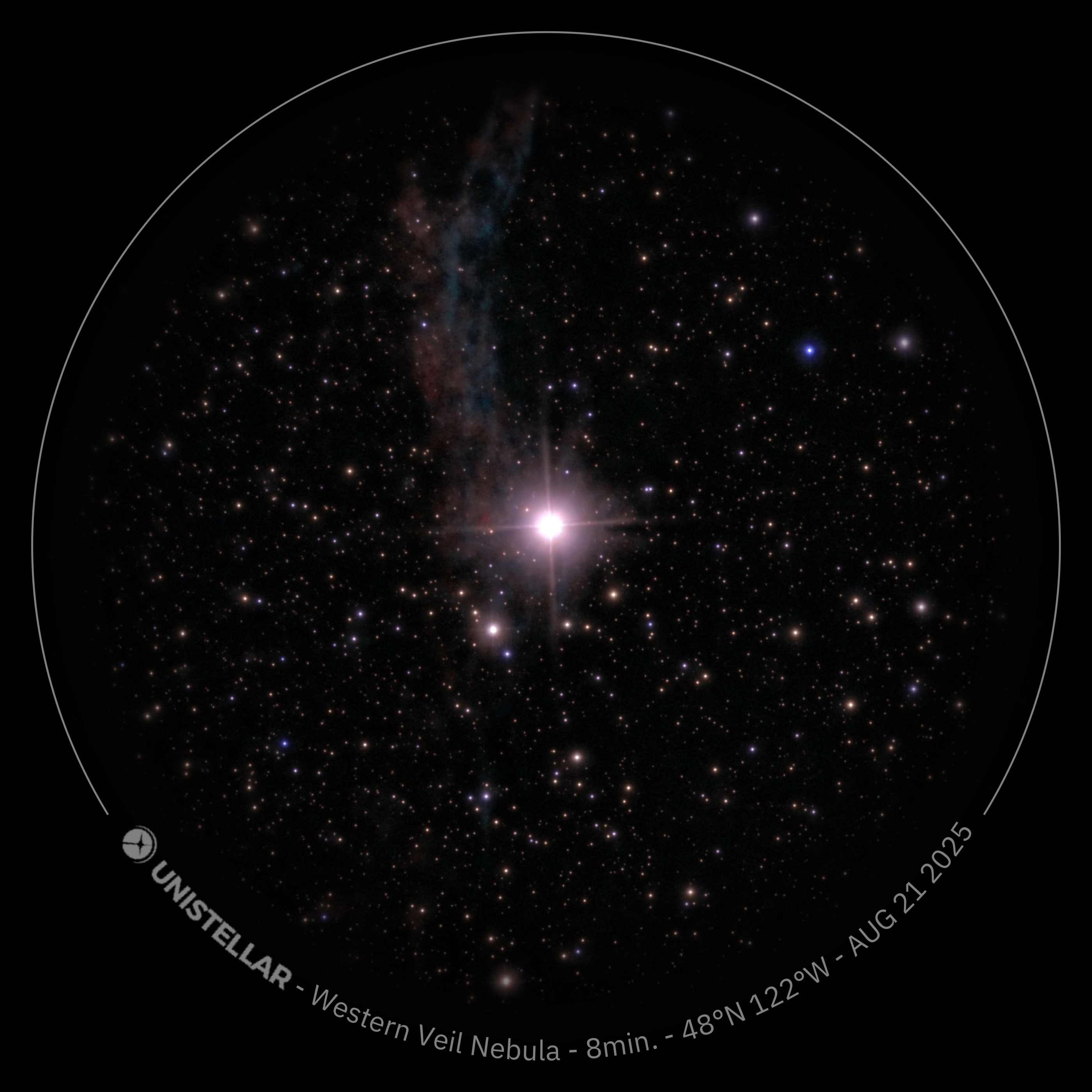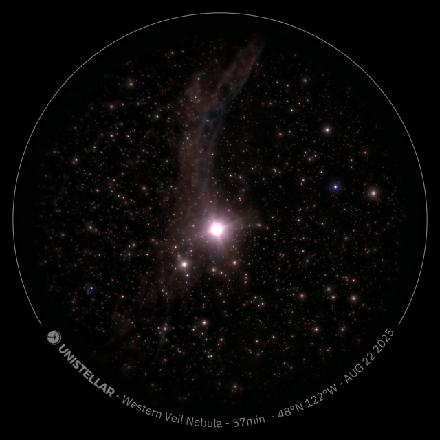 A longer shot of the western veil, and even though this was almost an hour, you can only make out faint elements. The bright star is 52 Cygni, which is what’s called a “foreground star.” The veil nebula is about 1,470 light years away, whereas 52 Cygni is only around 201 light years away.