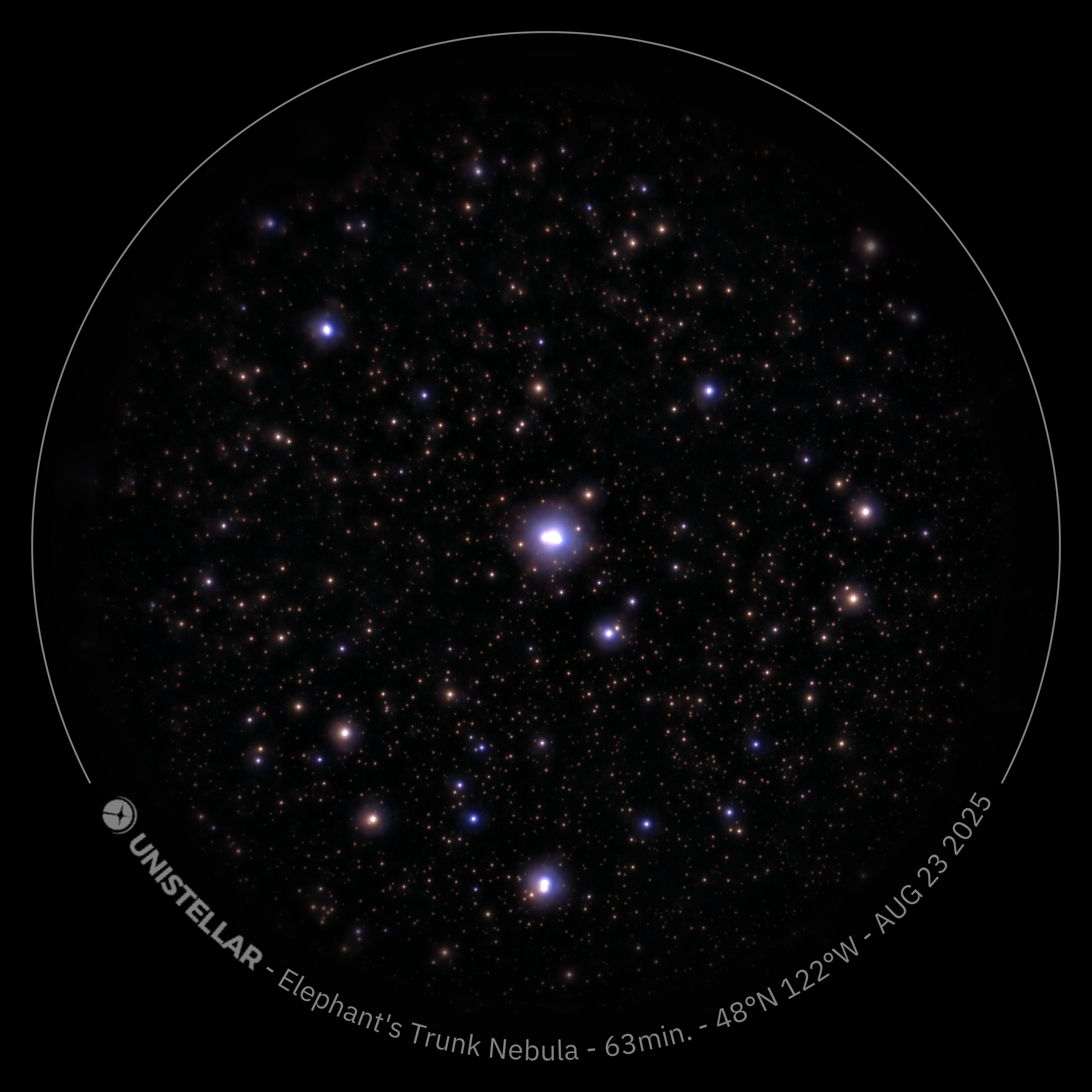Note: The Unistellar catalog appears to be incorrect if you search for the Elephant’s Trunk (at least as of August 2025). The Elephant’s Trunk is part of a much larger nebula called IC 1396A, which is a nebula that’s six times wider than the field of view. The center of that nebula is HD 206267A, which is the super bright triple star in the center of the above image. IC 1396A is very boring in the middle (pictured above), but much more interesting around its edges. The problem here is that the Unistellar catalog is mis-targeting one of the small, interesting parts (called the Elephant’s Trunk) and aiming the camera at the center of the larger nebula complex.